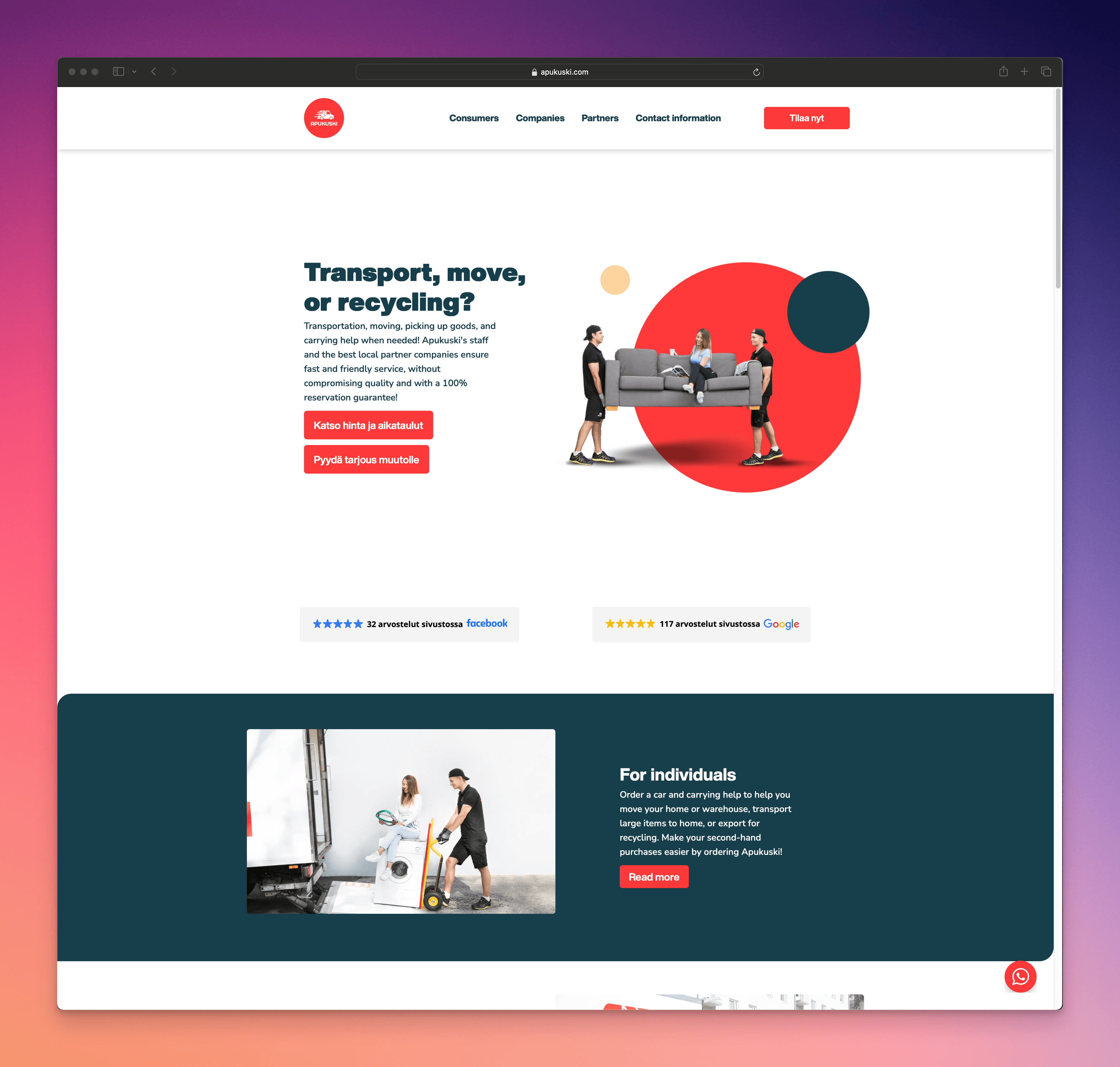 Apukuski provides efficient local transportation, moving, and goods pickup services. Their staff and local partner companies ensure fast, friendly, and quality service with a 100% reservation guarantee.